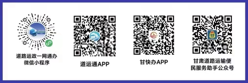 目前,我市已全面启用“跨省通办”、“电子证照”等业务,广大交通运输从业人员可通过扫描下列二维码在“道路运政一网通办微信小程序”、“甘快办 APP”、“道运通 APP“甘肃道路运输便民服务助手公众号”等入口办理具体道路运输事项。